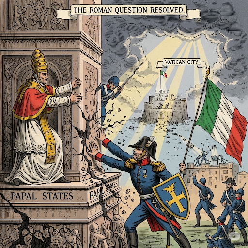 이탈리아 정부와 교황청 사이의 갈등을 **"로마 문제"**라고 불렀어요. 이탈리아는 교황에게 **"교황 보장법"**을 제정해 종교적 자유와 일정한 특권을 보장했지만, 교황청은 이를 거부했죠.
