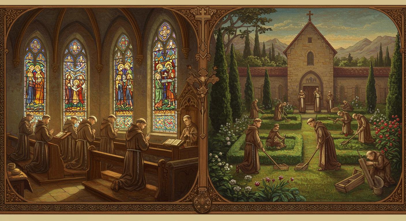 베네딕토가 저술한 수도 규칙은 73장으로 구성된 간결하면서도 실천적인 수도 생활 지침서입니다. 이전의 수도 규칙들, 특히 사막 교부들의 영성은 극단적 금욕과 고행을 강조했습니다. 시리아의 기둥 성인 시메온은 30년간 기둥 위에서 생활했고, 이집트의 은수자들은 평생 동굴에서 빵과 물만으로 연명했습니다. 그러나 베네딕토는 이러한 극단적 금욕주의가 대부분의 사람들에게는 지속 가능하지 않다는 것을 인식했습니다. 그의 규칙은 절제와 중용을 강조합니다. 규칙 서문에서 베네딕토는 이 규칙에는 가혹하거나 무거운 것이 없다고 말하며, 초심자들을 배려하는 온화함을 보여줍니다. 수도 규칙의 핵심은 오라 엣 라보라, 즉 기도하고 일하라는 원칙입니다. 하루를 기도와 노동, 독서로 균형있게 배분하여 영혼과 육체가 조화롭게 발전하도록 했습니다. 구체적으로 하루 8차례의 성무일도를 통해 공동체가 함께 하느님을 찬미하며, 4시간에서 6시간 정도의 육체노동으로 공동체의 생계를 유지하고, 2시간에서 3시간의 거룩한 독서로 영적 성장을 도모합니다. 또한 충분한 수면과 휴식, 적절한 식사를 보장하여 수도자들이 건강을 유지하도록 배려했습니다. 베네딕토는 포도주를 금지하지 않았으며, 노약자와 환자에게는 규칙을 완화하여 적용했습니다. 이러한 현실적이고 인간적인 접근 덕분에 베네딕토 규칙은 1500년이 지난 오늘날까지도 전 세계 수많은 수도원에서 실천되고 있습니다.
