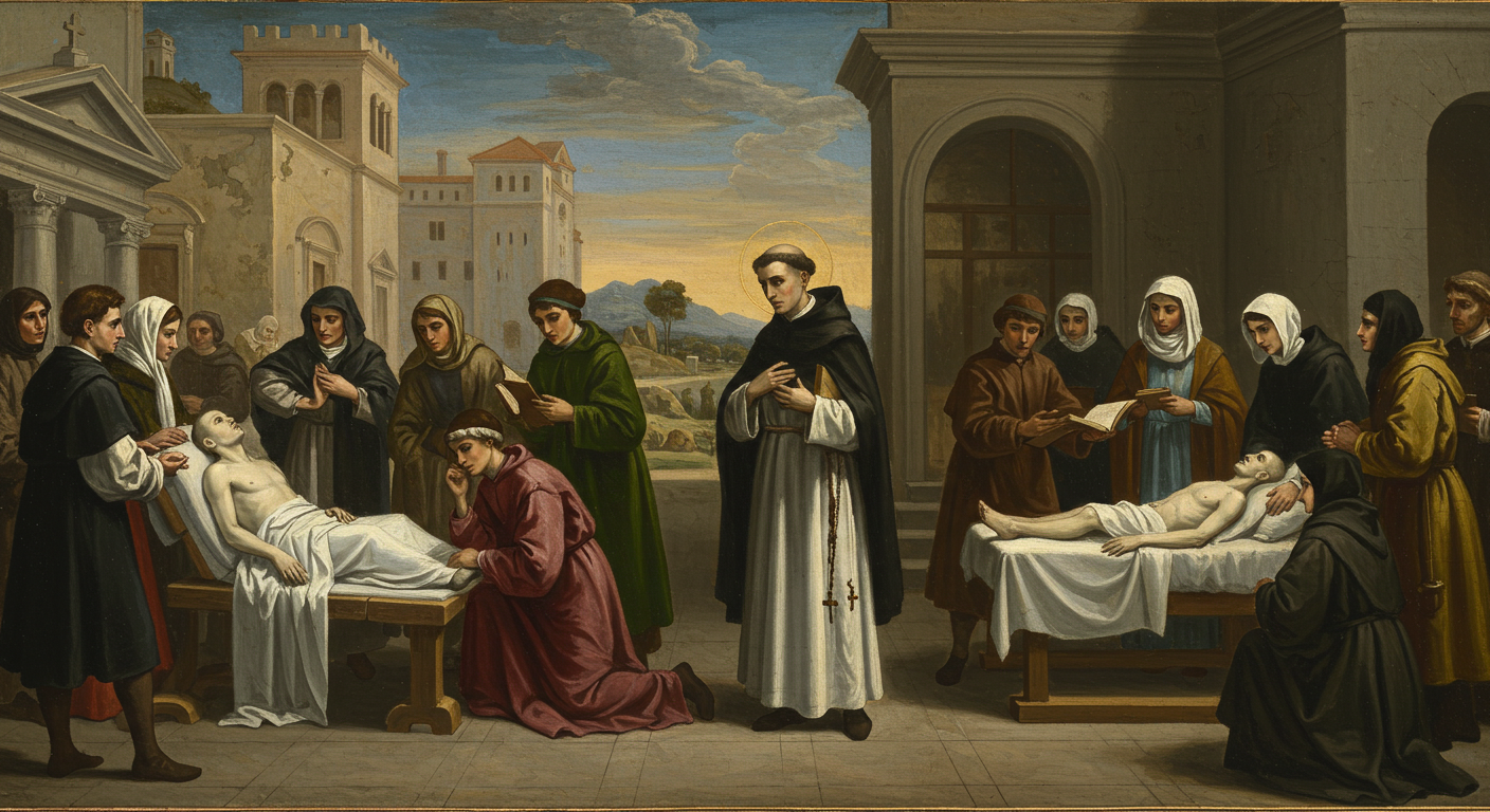 1614년 7월 14일, 성 카미로 데 렐리스는 64세의 나이로 로마에서 평안히 선종했습니다. 그의 임종 때 많은 사람들이 기적적인 현상들을 목격했다고 전해지며, 특히 그의 영혼이 하늘로 올라가는 환상을 본 이들이 있었다고 기록되어 있습니다. 그의 죽음은 로마 전체의 애도를 불러일으켰고, 교황 바오로 5세를 비롯한 교회 지도자들과 수많은 시민들이 그의 장례식에 참석했습니다. 당시 로마는 바로크 문화의 중심지로서 베르니니와 보로미니 같은 예술가들이 활동하던 시기였고, 교회 역시 트리엔트 공의회의 개혁 정신을 구현하기 위해 노력하고 있었습니다.