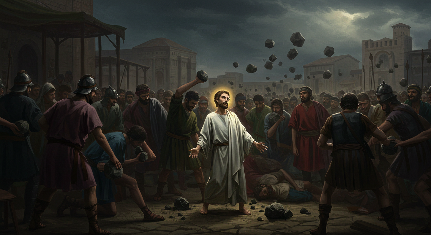 스테파노의 변론이 절정에 달했을 때, 정말 놀라운 일이 일어났어요. 성령이 충만한 스테파노가 하늘을 우러러보니 하느님의 영광과 예수께서 하느님 우편에 서신 것이 보였던 거예요. 그는 감격에 겨워 외쳤죠. "보라 하늘이 열리고 인자가 하느님 우편에 서신 것을 보노라!" 하지만 이 말이 공의회 사람들에게는 신성모독으로 들렸어요. 그들은 귀를 막고 일제히 스테파노에게 달려들었죠. 법적인 절차도 무시한 채 그를 성 밖으로 끌고 가서 돌로 치기 시작했어요. 이때가 바로 기독교 역사상 첫 번째 순교의 순간이었습니다.