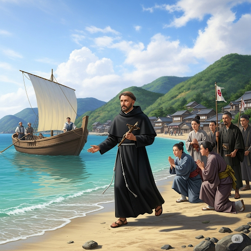 1549년 8월 15일, 하비에르는 코스메 데 토레스 신부, 후안 페르난데스 수사, 그리고 야지로와 함께 가고시마에 도착해요. 이날이 바로 일본 가톨릭 선교의 역사적 시작점이었답니다.
