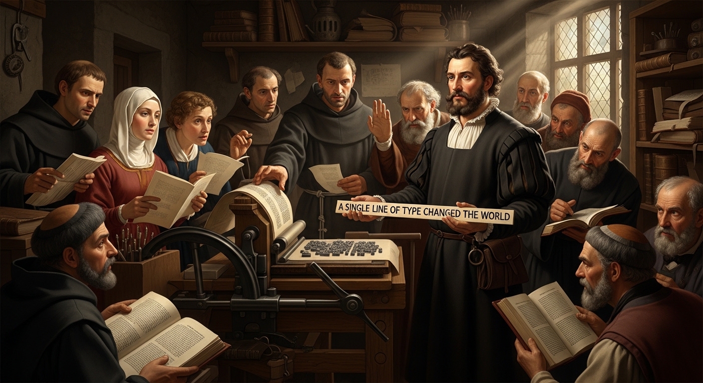 그러나 인쇄술은 교회에게 통제 불가능한 도전도 함께 가져왔습니다. 1517년 마르틴 루터(Martin Luther)가 비텐베르크 성당 문에 95개 논제를 붙인 것은 사실 하나의 학문적 토론 제안이었습니다. 그런데 그 논제가 라틴어에서 독일어로 번역되어 인쇄·배포되는 데는 불과 몇 주밖에 걸리지 않았습니다. 인쇄술이 없었다면 루터의 주장은 지역 신학 논쟁에 그쳤을 것입니다. 인쇄술이 있었기에 그것은 유럽 전체를 뒤흔든 종교개혁의 불씨가 되었습니다.