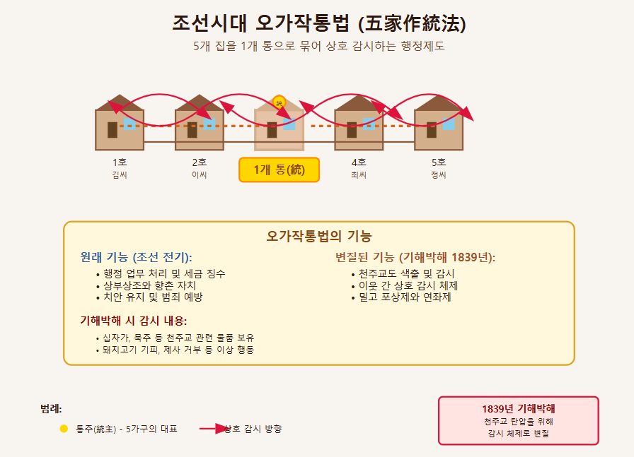 오가작통법은 원래 조선 초기부터 시행된 향촌 행정 제도였습니다. 다섯 집을 하나의 통으로 묶어 서로 돕고 치안을 유지하는 것이 본래 목적이었죠. 하지만 1839년 기해박해가 시작되면서 이 제도는 전혀 다른 성격으로 변질되었습니다.