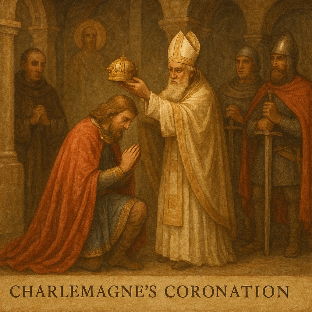 상상해 보세요. 크리스마스 미사가 한창인 성 베드로 대성당. 프랑크 왕국의 샤를마뉴가 기도를 위해 무릎을 꿇는 순간, 교황 레오 3세가 갑자기 황금 왕관을 그의 머리에 씌웠어요!